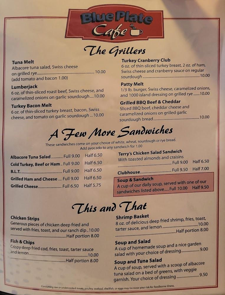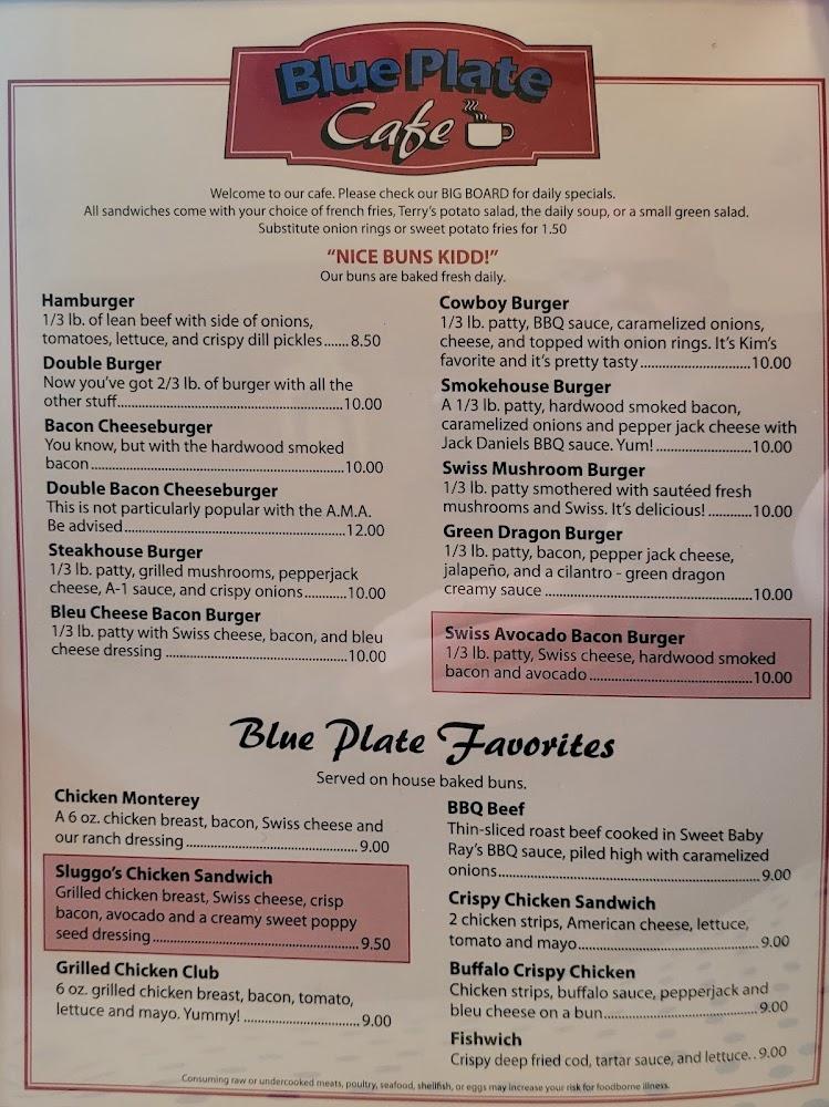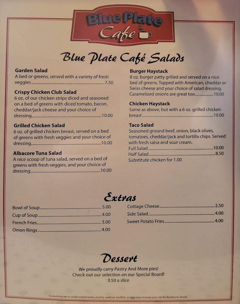 The menu at Blue Plate Cafe showcases American comfort food. Breakfast items reign supreme, with a variety of omelets and pancakes. The four egg omelettes are particularly popular. Lunch features hearty sandwiches and fresh salads. There's a vast selection of sides, from sweet potato fries to cottage cheese. For lighter options, the cafe offers healthy, smaller portions. Desserts provide a sweet end to meals, featuring local flavors. Everything is homemade, adding to the charm. Customers appreciate the emphasis on quality ingredients and traditional recipes.